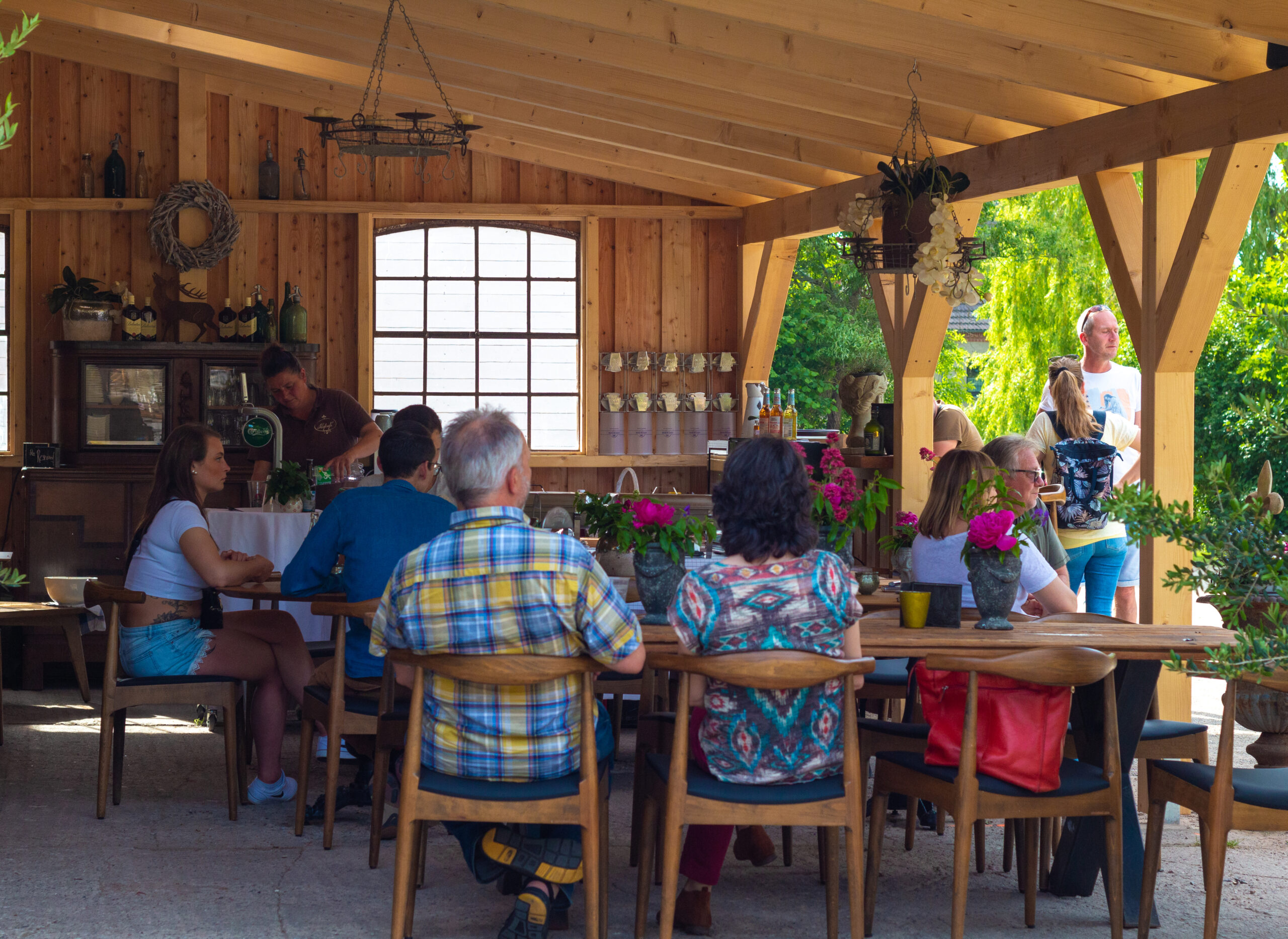 Neh­men Sie Platz zwi­schen duf­ten­den Som­mer­la­ven­del, Li­li­en und Oli­ven­bäu­men. Sie sind herz­lich ein­ge­la­den auf un­se­ren Son­nen­ter­ras­se und un­ter un­se­ren Wein­pa­vil­lons die gro­ße Aus­wahl an